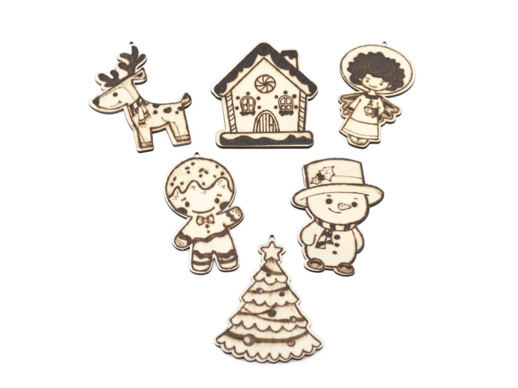 Angyal, hóember, karácsonyfa, rénszarvas, Perníček úr és egy házikó 3 mm vastagságú, kiváló minőségű AB/BB nyárfa rétegelt lemezből.